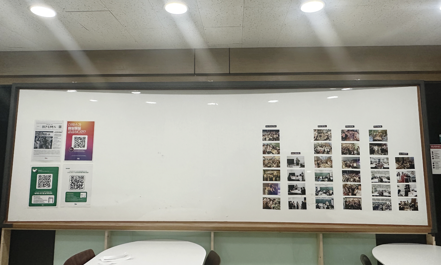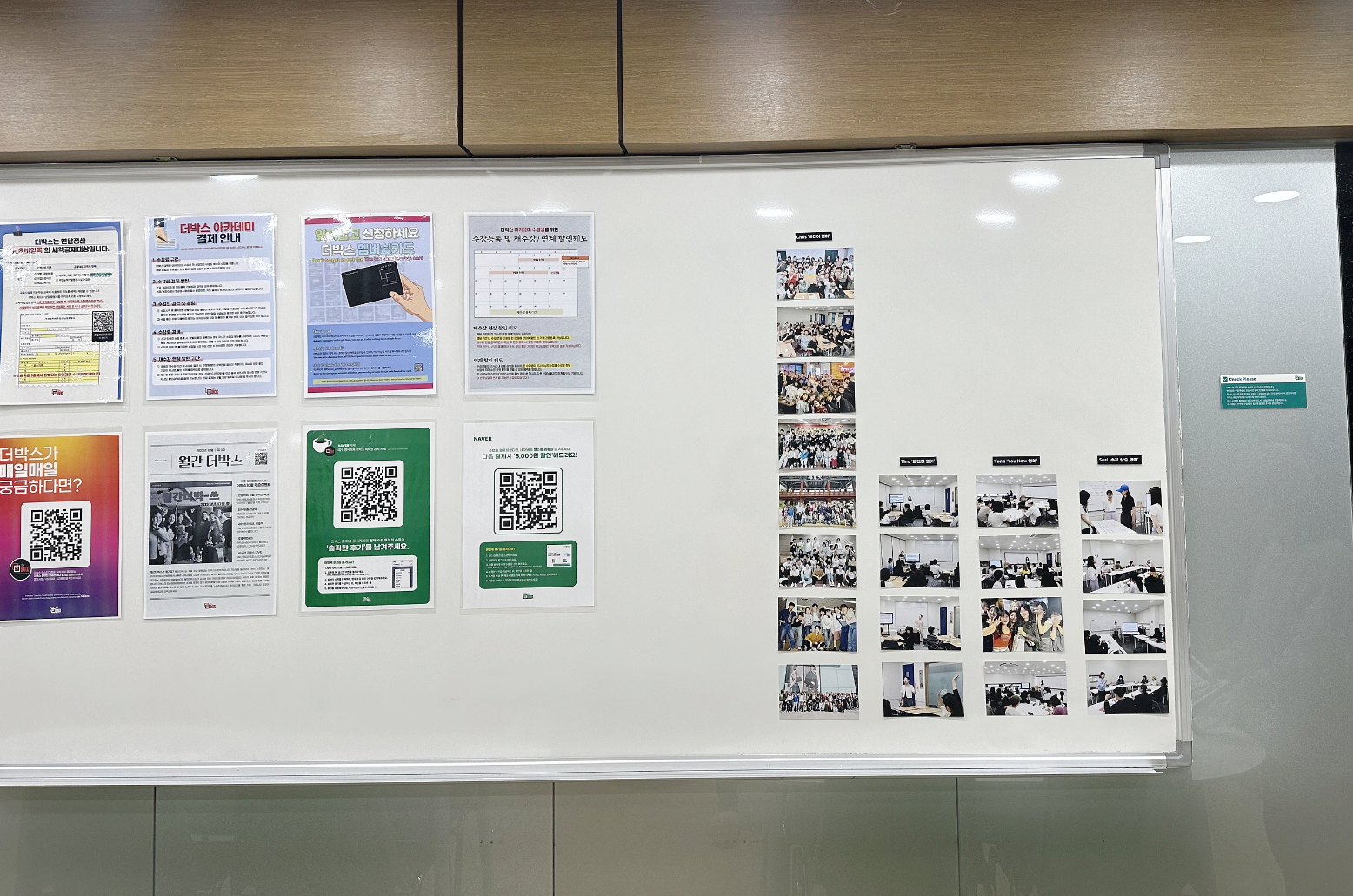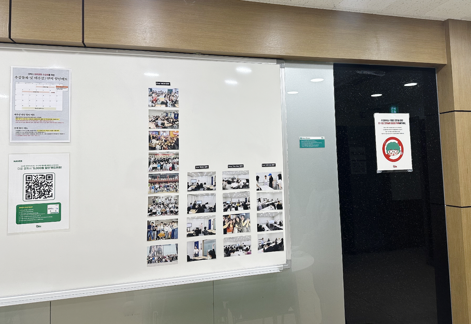 6층을 지키고 있는 문지기 같은 저는 7층 8층을 자주 방문을 하지는 못하지만, 공지사항을 게재할때마다 방문을 하거든용 그럴때마다 조금 더 대기공간에서 볼 거리가 있었으면 좋겠다 싶어서 요렇게 사진을 좀 붙여 봤어요. 어떤가용? 나름 열심히 인화해서 붙였는데 .. 고민햇어요 이걸 일자로 붙일까 아니면 약간 그런 감성st로 붙일까 고민을 햇는데 감성을 내다가 지저분한 스타일이 될까봐 반듯반듯하게 붙였답니다. 넓은 공간이 각 수업의 추억들로 가득 차게 되었으면 좋겠습니다.