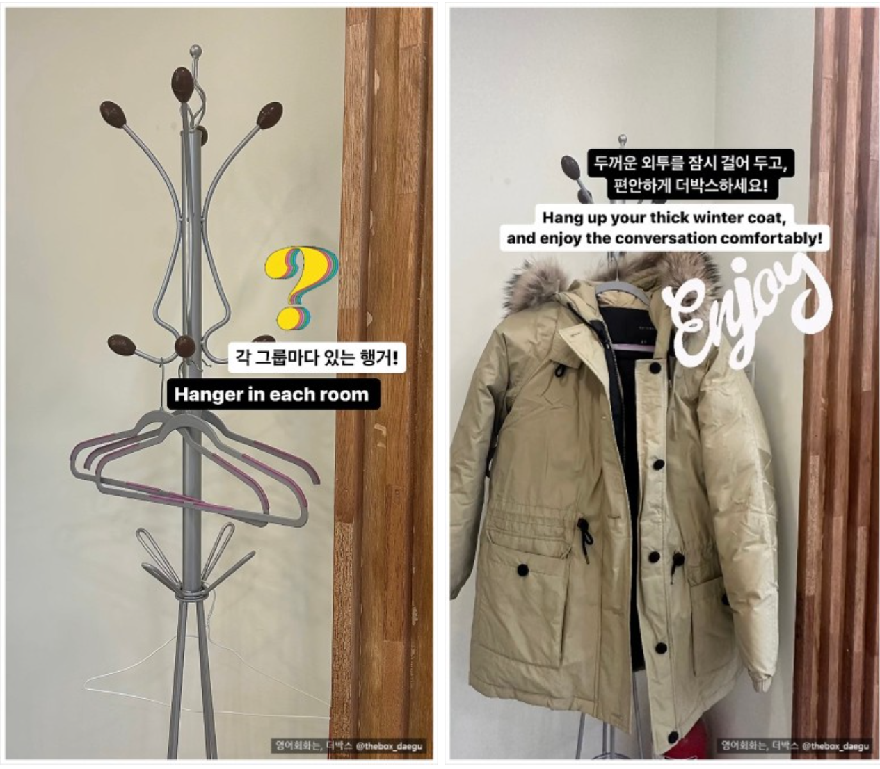 요건 제가 인스타 스토리를 통해서 한번 소개한적이 있는 행어죠? 기온이 내려가다보니까 외투도 두꺼워지고, 이야기를 나누는데에 있어서 두꺼운 외투가 여간 불편한게 아니라서, 요렇게 각 그룹마다 행어를 마련해두엇답니다. 두꺼운 외투를 잠시 걸어두고, 편안하게 더박스를 즐기셨으면 좋겠어요! 아 너무 센스있었나 ..