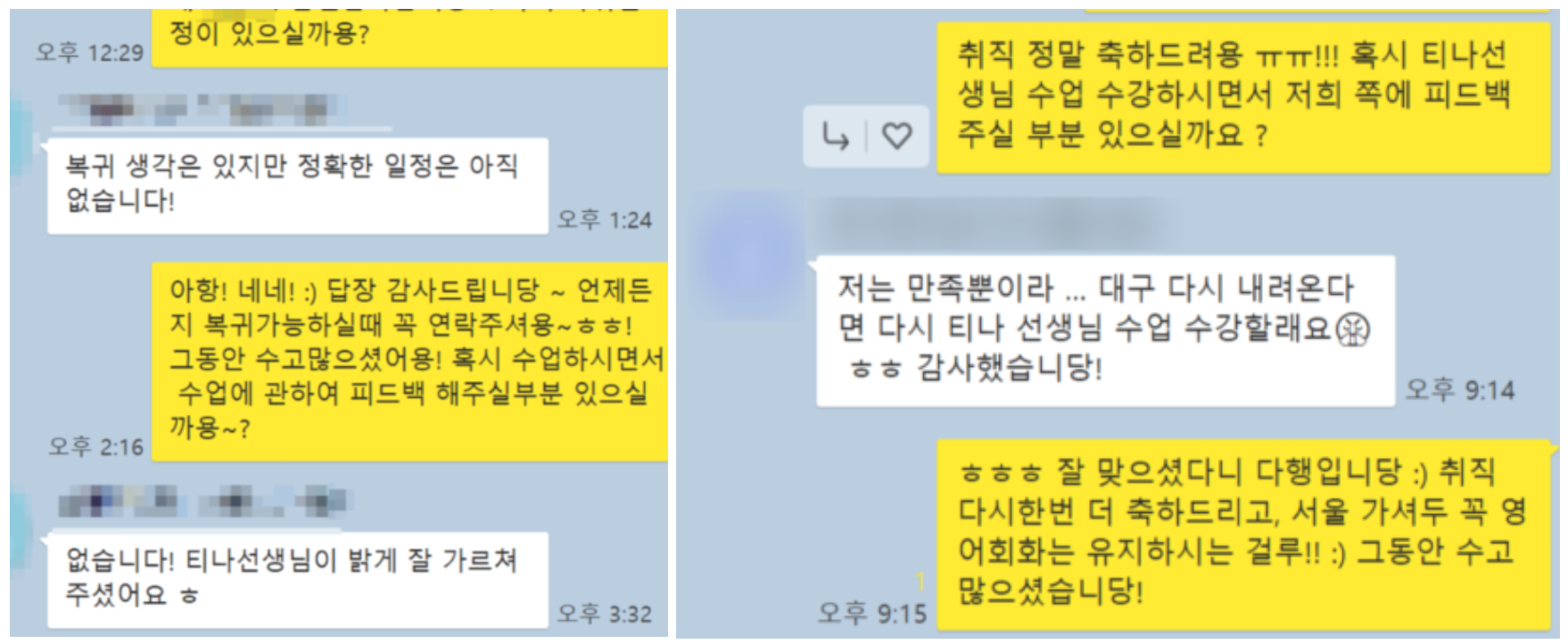 선생님의 특유의 매력과 밝은 에너지로 영어 울렁증이 있는 분들도 자신감을 얻어갈 수 있는 수업이에요! 영어회화에서는 자신감도 중요한 부분중 하나인거 아시죠?