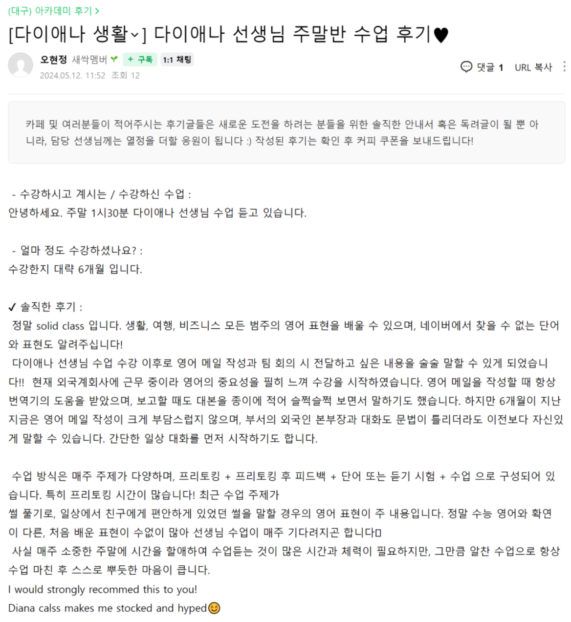 안녕하세요. 주말 1시30분 다이애나 선생님 수업 듣고 있습니다. - 얼마 정도 수강하셨나요? : 수강한지 대략 6개월 입니다. ✔ 솔직한 후기 : 정말 solid c...