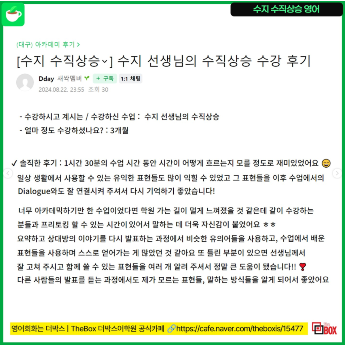 | 대구 성인영어회화 더박스 해야하는 이유! 실제 참여 후기 (0) | 2024.08.19 |