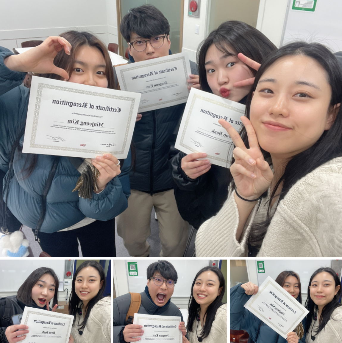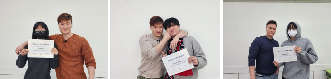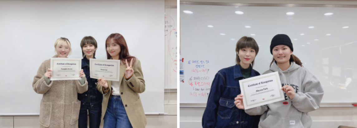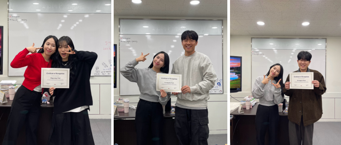 이번에 대구 영어회화 학원 아카데미 수업으로 top3는 두번으로 나뉘었는데요. 12월 연말을 마무리하는 top3와 1월 새해를 시작하는 top3로 나뉘었습니다! 12월에 시상된 top3분들 축하드려요! 선생님께서 직접 뽑아서 시상을 해주시는 상이기 때문에 조금 더 의미가 있겠죠? 한해동안 불태웠던 열정을 내년에도 더 지펴주세요! 축하드립니당!