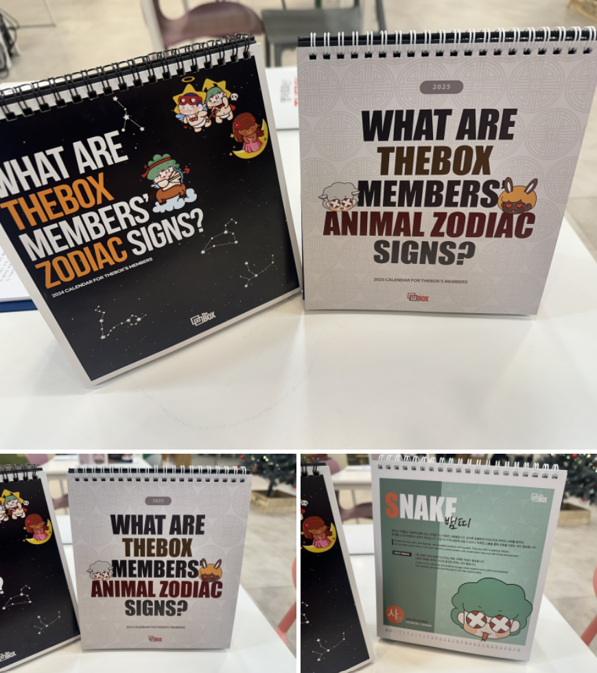 매년 나눠드리는 달력입니다. 24년에는 별자리(zodiac)이었다면, 이번에는 띠별 달력이에요! animal zodiac ! 12개의 띠별 25년 운세를 짧막하게 알아볼 수 있도록 했답니다. 귀여우면 더 좋잖아요? 귀엽게 한 번 만들어 봤어요! 1000부를 손수 포장해서 여러분들께 나눠드렸습니다. 내년 한해도 여러분의 하루하루에 더박스가 함께하기를 바라는 마음이랍니다.