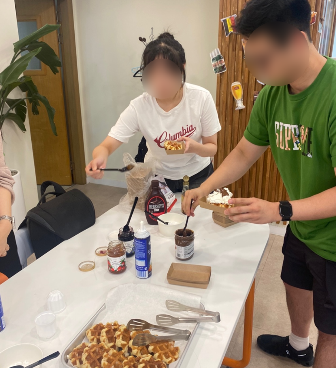 구워진 와플에 휘핑크림, 블루베리 콩포트, 다양한 과일잼과 누텔라까지 여러가지 토핑으로 각자 입맛에 맞는 개성있는 와플 조합👍