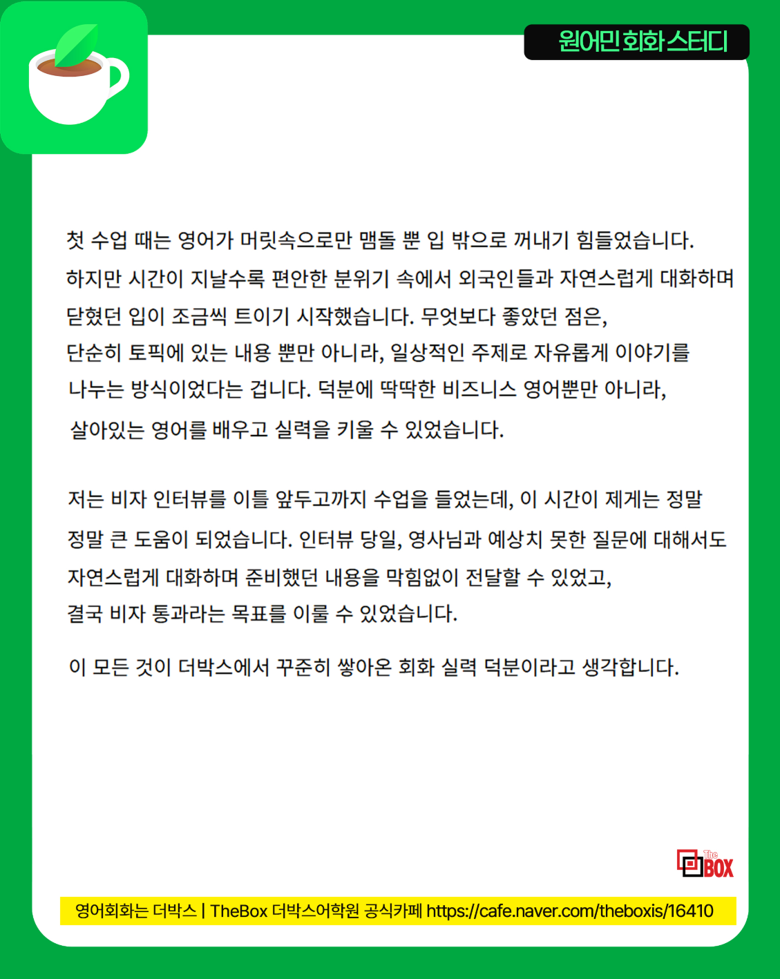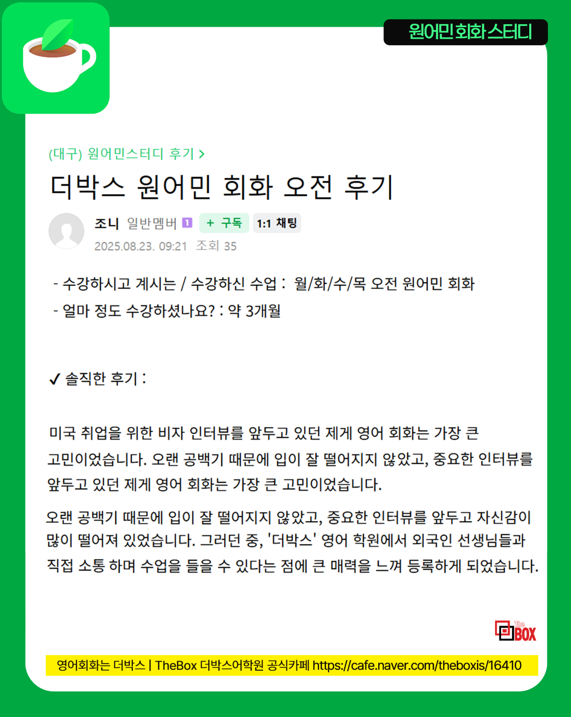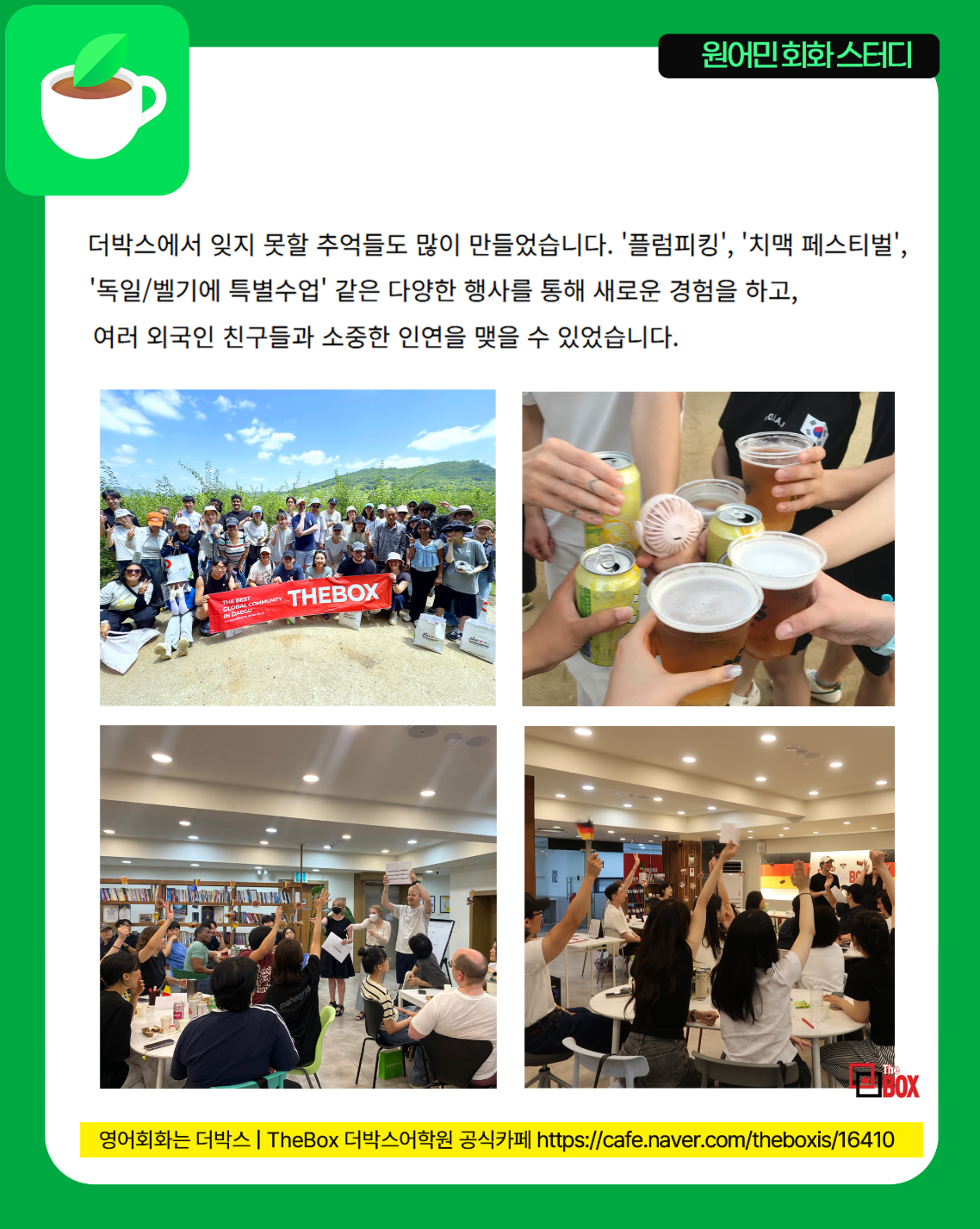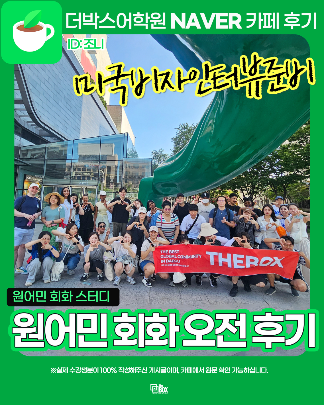 | 대구 성인영어회화 더박스 해야하는 이유! 실제 참여 후기 (0) | 2024.08.19 |