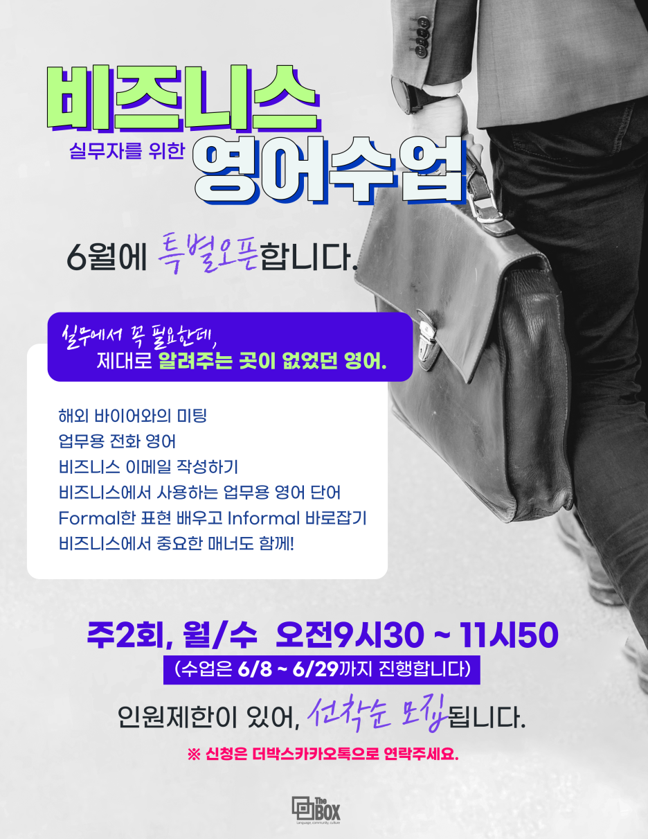 그래서 지금 더박스 랜디쌤이 진행하는 비즈니스 영어 수업 추천해 주었어요! 여러분들께도 어떤 비즈니스 영어를 배우게 될지 한 번 알려 드릴게요!!