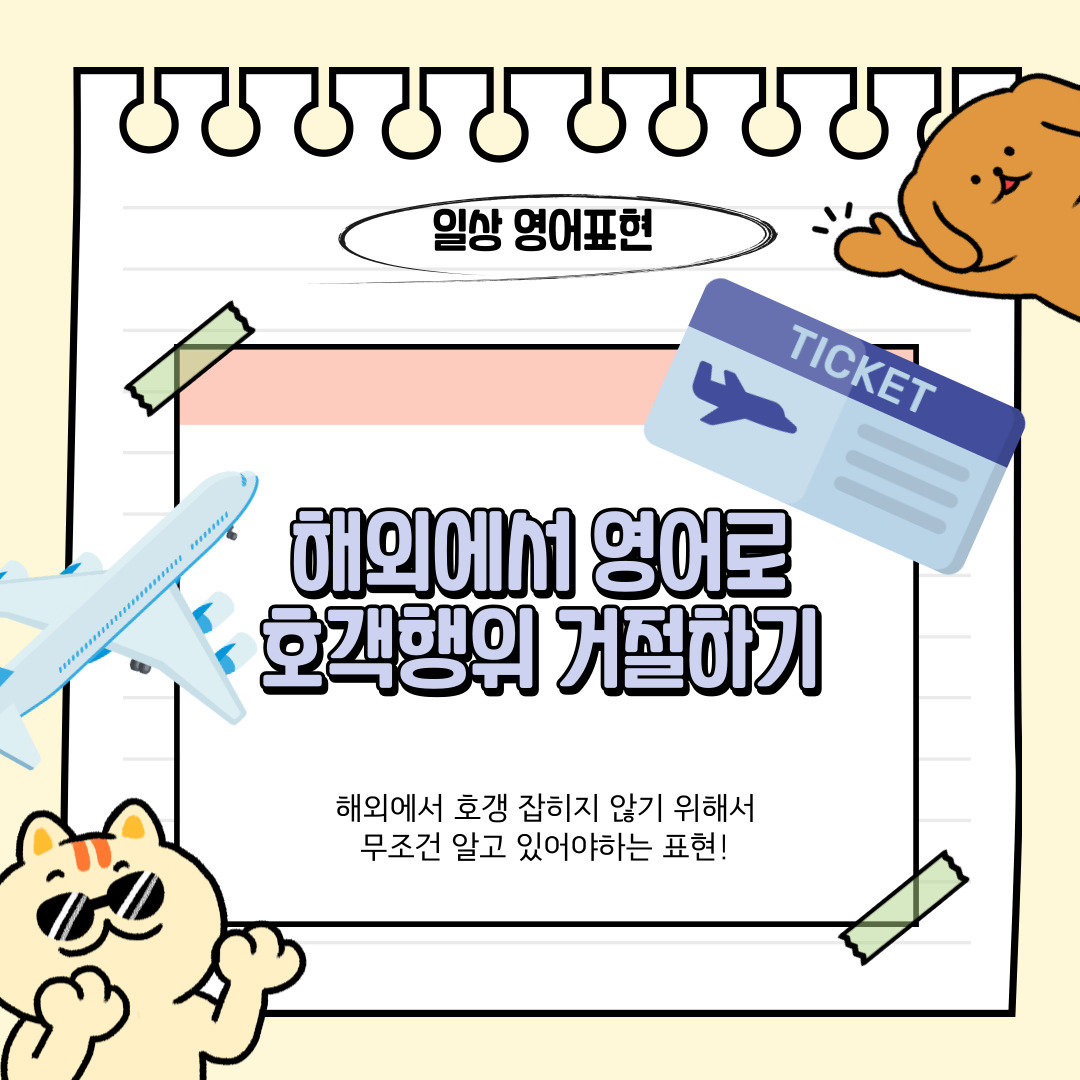 이것들도 알아 두시면 좋은 여행에서 활용도가 높은 기초 영어 표현입니다!! 어렵지 않죠?! 기분 좋게 간 해외여행에서 호객행위로 기분을 망칠 수는 없잖아요!! 잘 외워두셨다가 꼭 활용하시길 바랍니다!