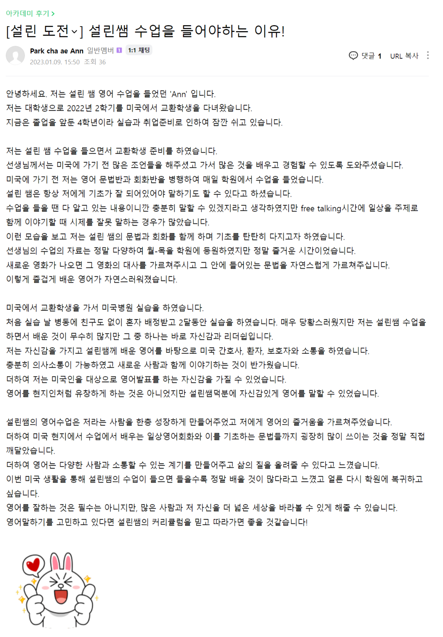 설린 선생님 영어회화 수업을 들었던 앤님의 수강후기입니다.