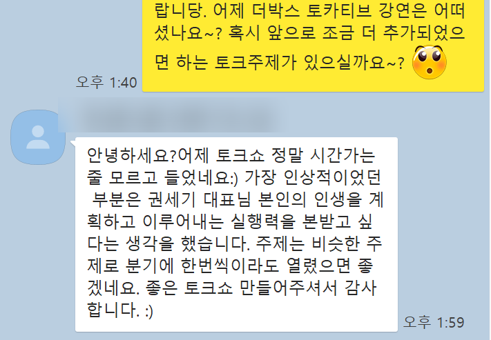 여ㅇㅇ님 : 안녕하세요? 어제 토크쇼 정말 시간가는 줄 모르고 들었네요 :) 가장 인상적이었던 부분은 권세기 대표님 본인의 인생을 계획하고 이루어내는 실행력을 본받고 싶다는 생각을 했습니다. 주제는 비슷한 주제로 분기에 한번씩이라도 열렷으면 좋겠네요. 좋은 토크쇼 만들어주셔서 감사합니다 :)