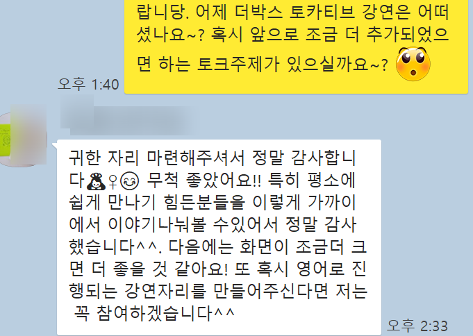 최ㅇㅇ님 : 귀한자리 마련해주셔서 정말 감사합니다. 무척 좋았어요 !! 특히 평소에 쉽게 만나기 힘든 분들을 이렇게 가까이에서 이야기나눠볼 수 있어서 정말 감사했습니다 ^^. 다음에는 화면이 조금 더 크면 더 좋을 것 같아요! 또 혹시 영어로 진행되는 강연자리를 만들어주신다면 저는 꼭 참여하겠습니다 ^^