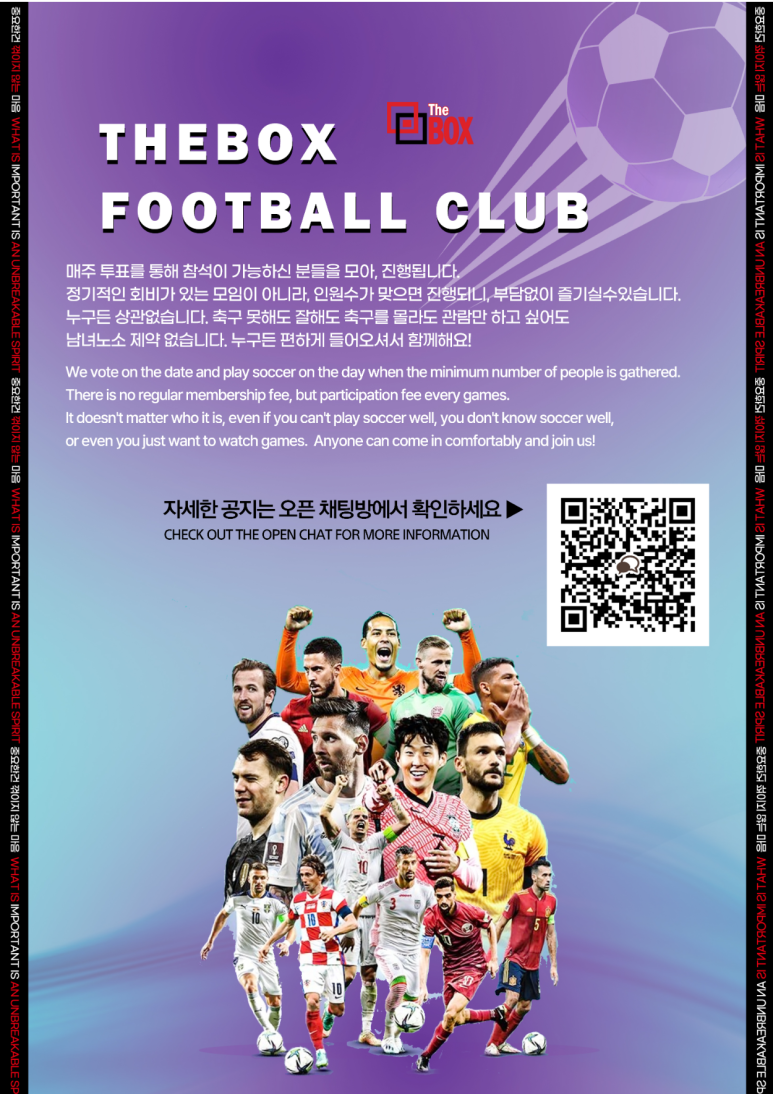 축구를 못하셔도 괜찮고, 그냥 구경만해도 괜찮고, 누구든 괜찮으니, 더박스에서 다양한 국가의 친구들과 함께 운동해보시는거 어떨까요?